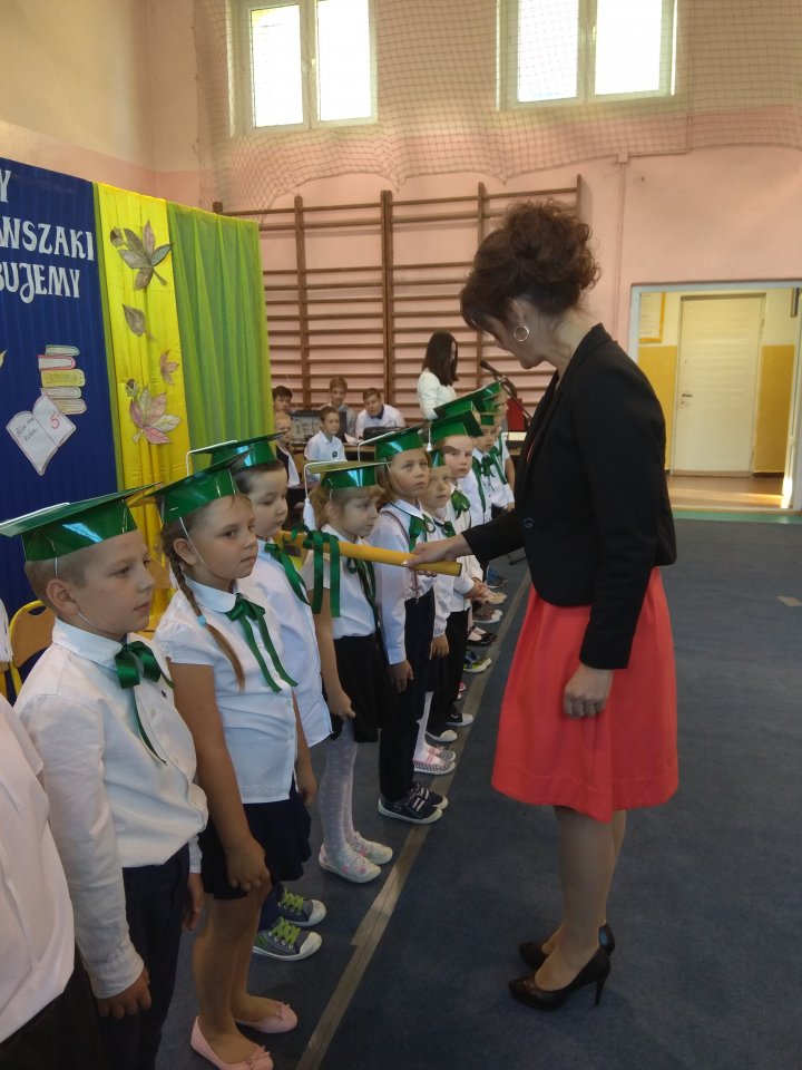Po programie artystycznym Pani Dyrektor uroczyście pasowała uczniów,którzy ślubowali „(…) być dobrym Polakiem, dbać o dobre imię swojej klasy i szkoły.(…)”.